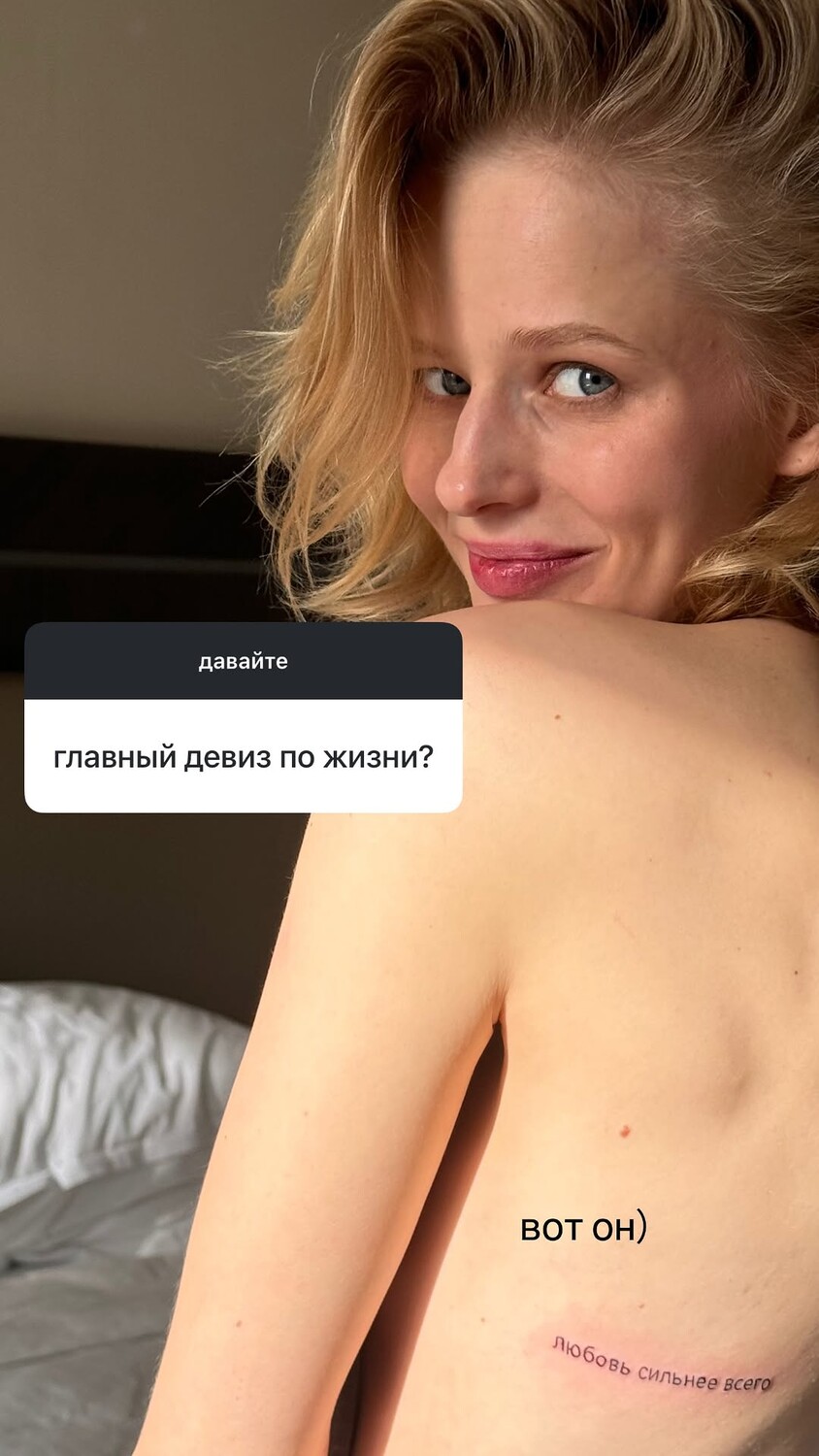 31-летняя Саша Бортич сидела на кровати, повернувшись спиной к камере. Актриса показала татуировку с надписью «Любовь сильнее всего», которую набила на спине. Знаменитость позировала с распущенными волосами и без макияжа.